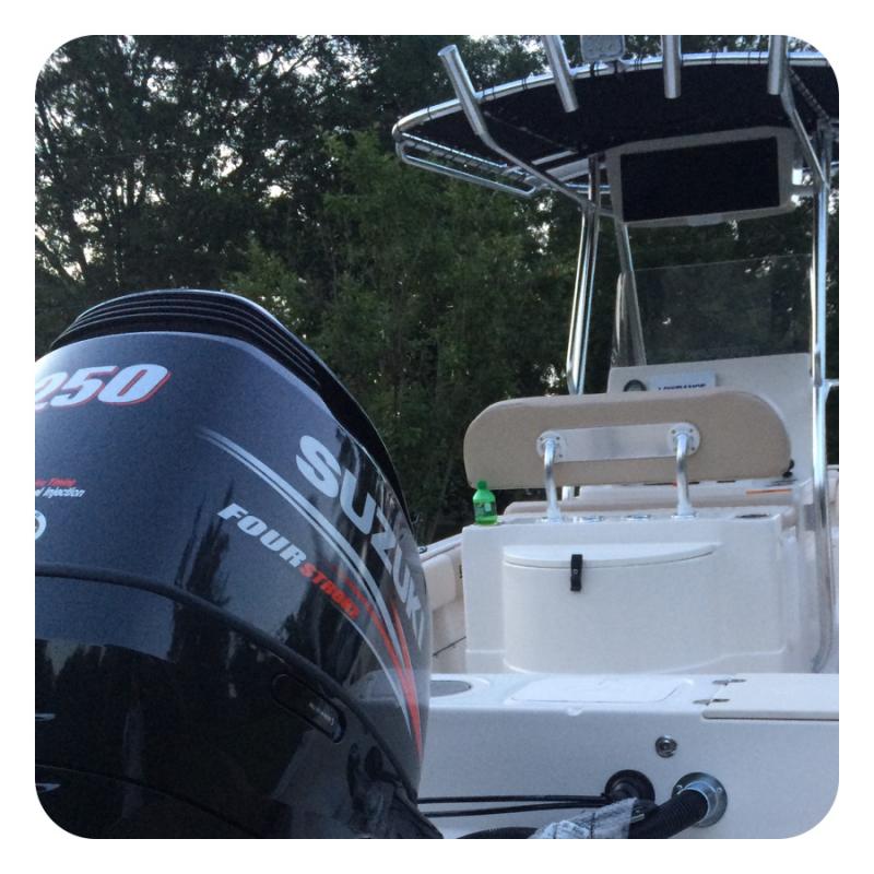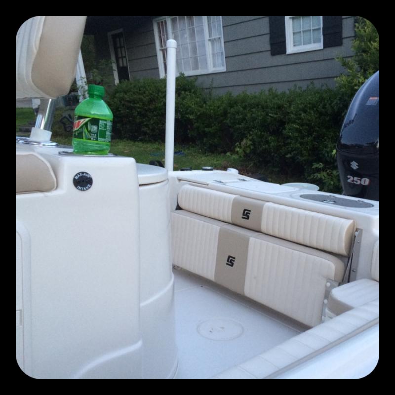 Above you see a back view of the boat, where a Suzuki DF250 Four Stroke anchors it down. Straight in front of the engine is a fiberglass leaning post with a 32 gallon live well and a removable back rest.The boat also has a 20 gallon live well that you can barely see right below the "I" in Suzuki on the engine.