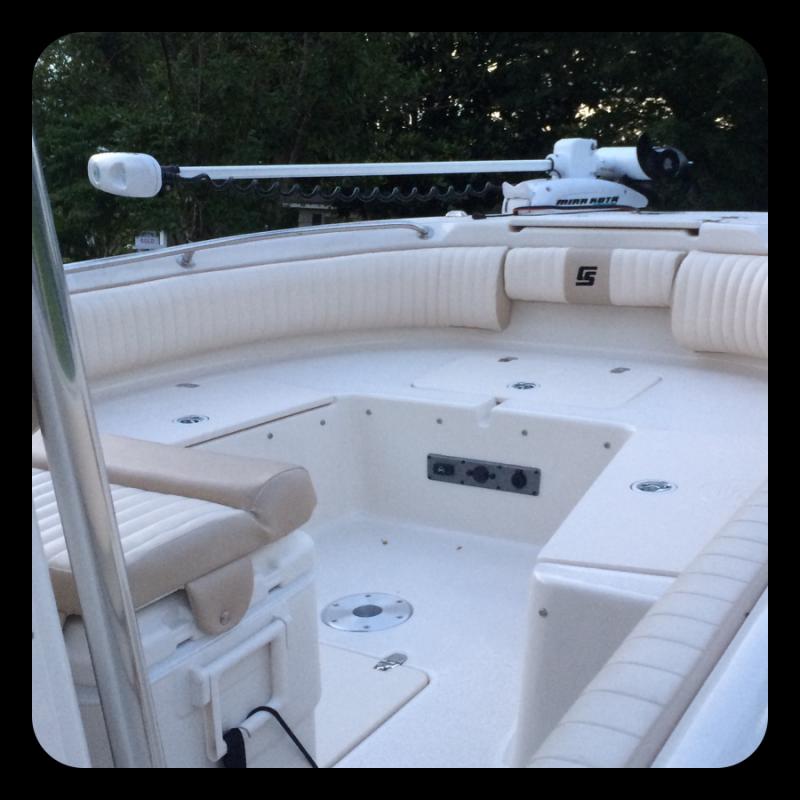 Up front there is plenty of room with the wrap around front end. The boat comes with cushions for the front. but they want be on the boat while I own it. It also has a cooler seat with a cushion, three large storage bends, and a Minn Kota RipTide ST I-Pilot 80lb. thrust.